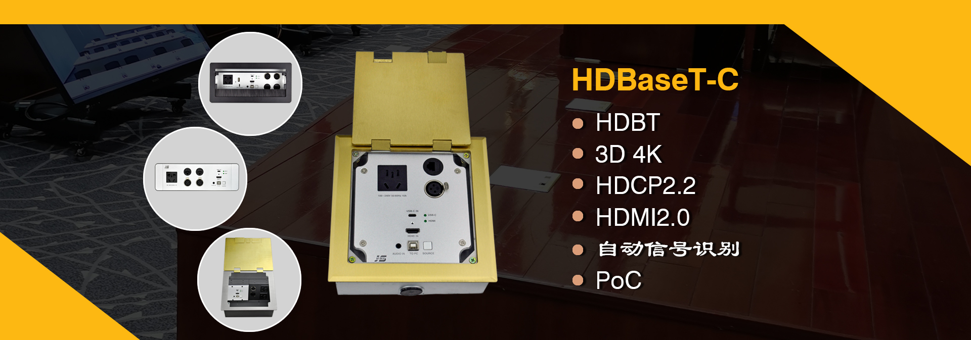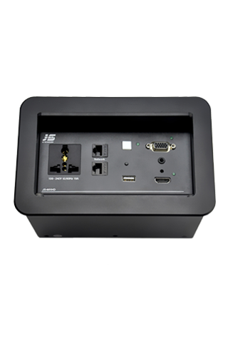 ? 某公司視頻會(huì)議項(xiàng)目,在設(shè)備選型中,金視JS-MF定制桌面插座)成為項(xiàng)目選定品牌及型號(hào),視頻會(huì)議共使用43套金視產(chǎn)品;(其中21臺(tái)為銀色,19臺(tái)黑色 分1層和5層會(huì)議室使用)? 金視JS-MF定制產(chǎn)品?桌面電動(dòng)翻轉(zhuǎn)插座,可藏式接線盒提供了一個(gè)整潔、緊湊、簡(jiǎn)單的連接解決方案。采用電動(dòng)控制,使用時(shí)只需輕按接線盒開啟按鍵,接線盒 180°旋轉(zhuǎn),隱藏的各種接口即展現(xiàn)