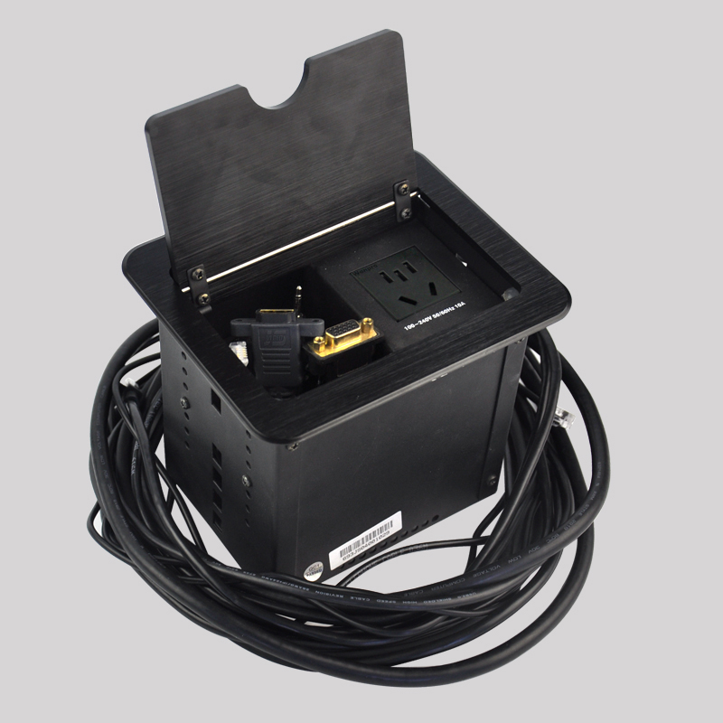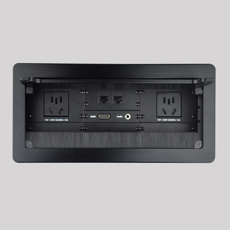 ? JS-5+系列可藏式接線盒提供了一個整潔、緊湊、簡單的鏈接解決方案。接線盒采用氣動與機械閉鎖式結構、上下接口貫穿式設計,巧妙的實現升起和閉合。使用時只需輕按接線盒頂部,釋放機械閉鎖,接線盒被氣動裝置順暢撐開,隱藏的電源、網絡、電話、視頻、音頻等各種接口即呈45°展現出來。使用完畢后,輕按接線盒頂部,機械閉鎖關閉,各種接口隱藏起來,隱藏后的接線盒與平臺保持水平。