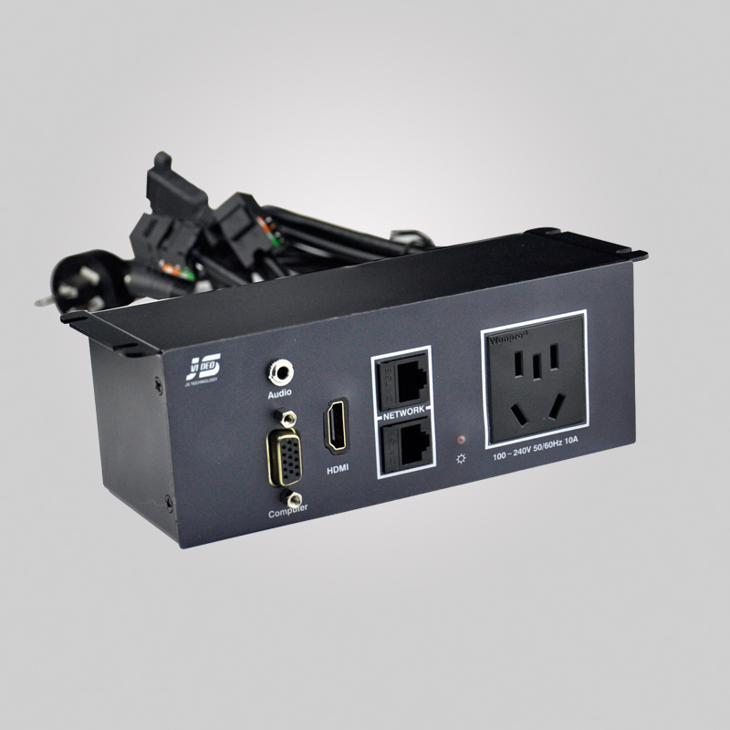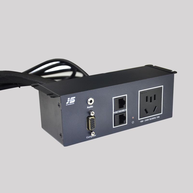 JS-Z400自收式接線盒提供了一個整潔、緊湊、簡單的連接解決方案,接線盒采用掀蓋式結構設計,使用時掀起內面板,各種線纜及接口展現出來;線纜采用自收式設計,使用時直接拉出線纜連接后即可使用,使用完畢線纜可自動收回接線盒內,實現了開會簡單入手、閉會就走,使整個會議桌面整潔、有序。