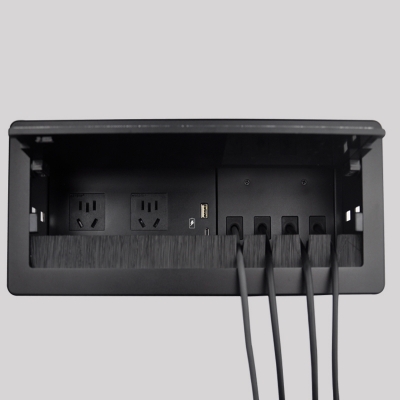 JS-Z400自收式接線盒提供了一個整潔、緊湊、簡單的連接解決方案,接線盒采用掀蓋式結構設計,使用時掀起內面板,各種線纜及接口展現出來;線纜采用自收式設計,使用時直接拉出線纜連接后即可使用,使用完畢線纜可自動收回接線盒內,實現了開會簡單入手、閉會就走,使整個會議桌面整潔、有序。